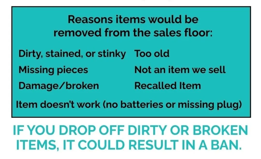 Space planning is hard, especially when we don’t know exactly what is coming in. There is a chance that we will run out of space for large items toward the end of the last drop-off day. If this happens, the large items brought in may be stored off the sales floor until space is available. Choose your drop-off time wisely.